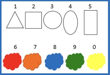- У вас у всех есть карточка-подсказка. (Рис 3). Где цифры 1,2,3,4,5, обозначают какую-либо геометрическую фигуру. А цифры 6,7,8,9,0 обозначают цвет вашей фигуры. А еще у вас есть бусины-фигуры в коробочке.