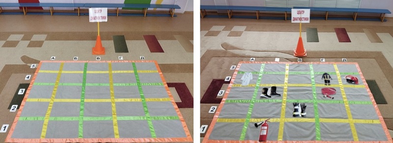 Учитель-логопед 1: Ребята, я рада приветствовать вас в центре диагностики. Вы наверняка знаете, что пожарным необходимо быстро ориентироваться в пространстве, в данном центре мы проверим, насколько хорошо вы умеете ориентироваться.