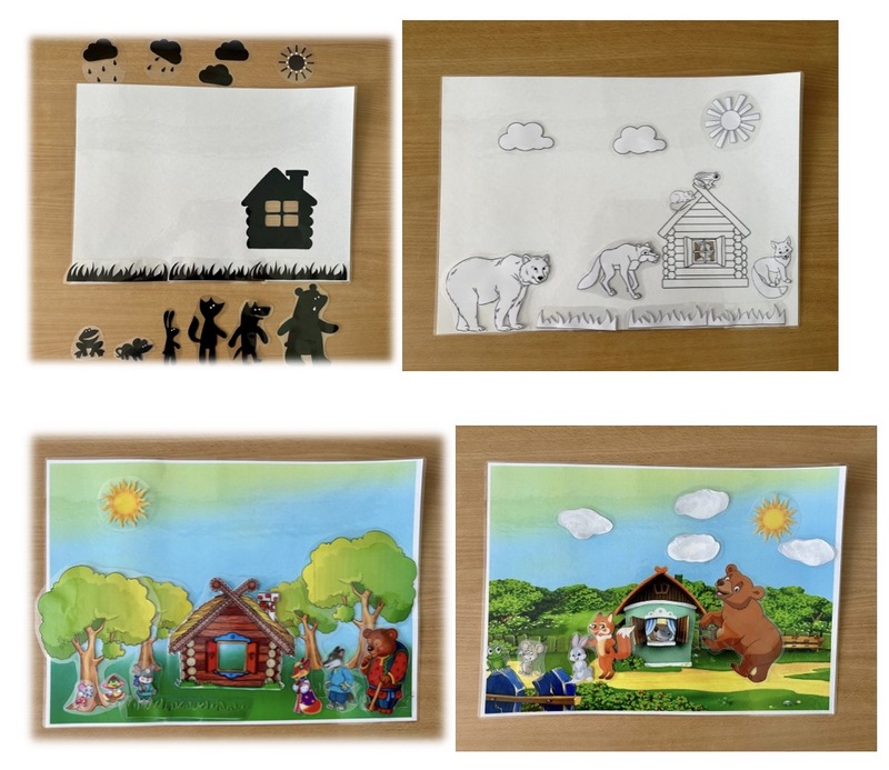Оно состоит из 4ех заламинированных полей формата А5 с постепенным усложнением фона (силуэтный, контурный, цветной, цветной сложный) и соответствующих этому фону фигурок (персонажи, элементы природы).