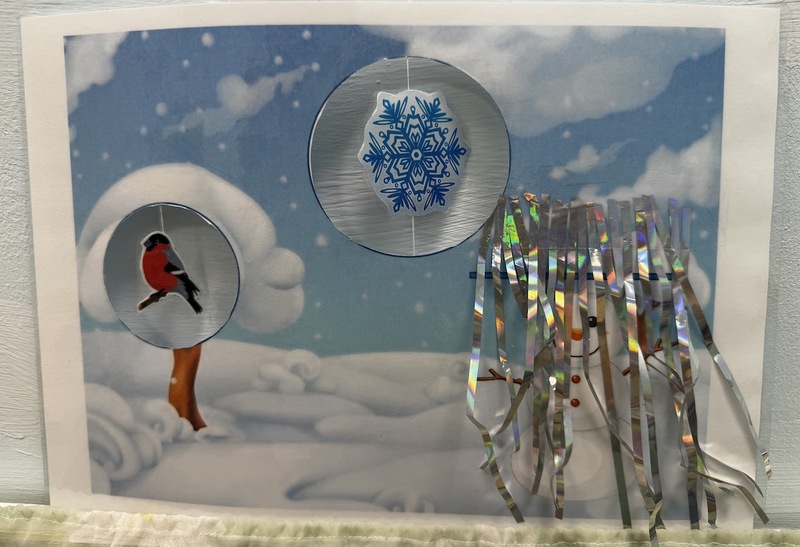 Снегиря подклеить (сверху) на нитку в окошко на дереве, снежинку подклеить (сверху и снизу) на нитку в окошке на небе.