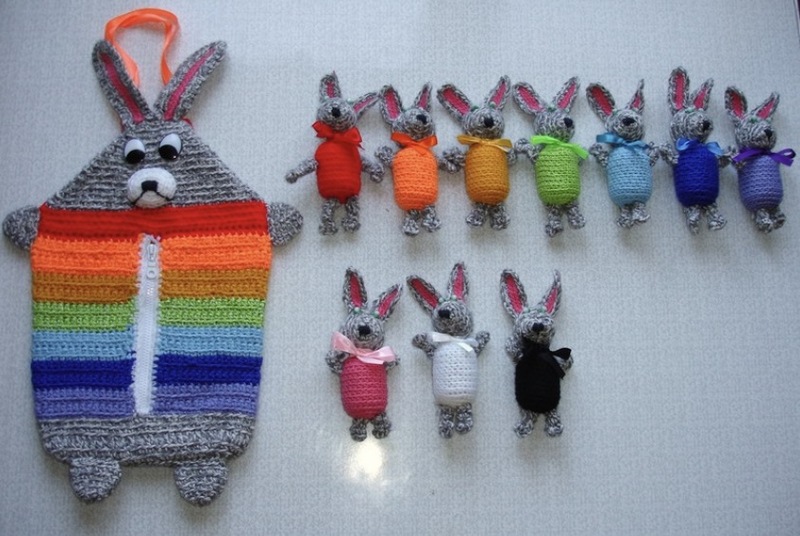 Описание: сумочка связана крючком из шерстяной пряжи разных цветов (серый, розовый, белый, красный, оранжевый, желтый, зеленый, голубой, синий, фиолетовый). Игрушка застегивается за замок «молнию». Внутри сумочки находятся 10 игрушек-зайчат (также связаны крючком из шерстяной пряжи). Все зайчата разного цвета: красный, оранжевый, желтый, зеленый, голубой, синий, фиолетовый, розовый, черный и белый. Внутри каждой игрушки-зайчонка контейнер от шоколадного яйца «Киндер-сюрприз» с разными наполнителями (горох, фасоль, гречневая крупа, пшено, крупные бусины из пластика и дерева, бисер, мелкие монеты, фантики от конфет, стеклянные шарики) за счет разных наполнителей зайчата гремят как погремушки (у каждой игрушки свой шум). У каждого зайчонка на шее бантик из атласной ленты (того же цвета).