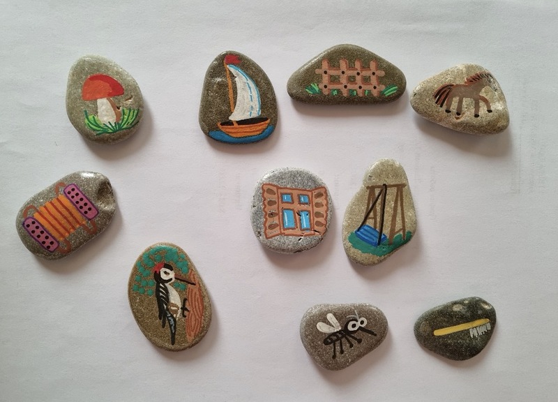 Морская галька интересный природный материал, который достаточно разнообразный по цветовой гамме, форме, очертаниям. Плоские, округлой формы камни легли в основу для изготовления наглядного материала при проведении артикуляционной гимнастики. С помощью маркеров, позволяющих делать изображения на камне, я нарисовала на них предметные картинки (двухстороннее изображение), соответствующие определённым артикуляционным упражнениям: «расчёска», «слон», «лошадка», «часики», «качели», «блинчики», «вкусное варенье», «гриб», «дятел». «комарик» и др.