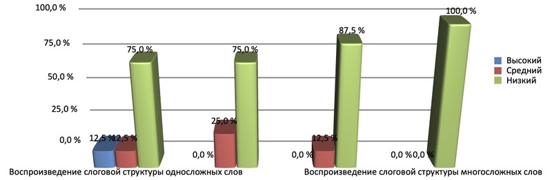 Диагностируя детей старшего дошкольного возраста с общим недоразвитием речи, мы получили следующие результаты: 75% детей имеют низкий уровень воспроизведения односложных слов, двусложных слов также 75%, трёхсложных слов - 87,5%, многосложных слов видим, что низкий уровень воспроизведения слоговой структуры имеют 100% детей старшего дошкольного возраста с общим недоразвитием речи.