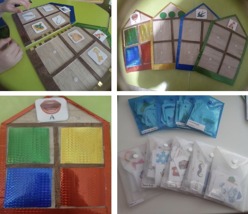 Каждый домик выполняет свою функциональную задачу. Для желтого домика подобран дидактический материал для развития слухового внимания, слухоречевой памяти, понимание речи. Для красного, синего и зеленного домика подобран материал для развития фонематического восприятия, автоматизации и дифференциации звуков. Игры и упражнения с данным пособием имеют большой диапазон вариативности и многофункциональности. Весь речевой материал выполняется в определенном формате, карточки заламинированы, на липучках, что делает их практичными и удобными в игровой деятельности. В комплекте одной игры используется 12 карточек - картинок, по количеству окон.