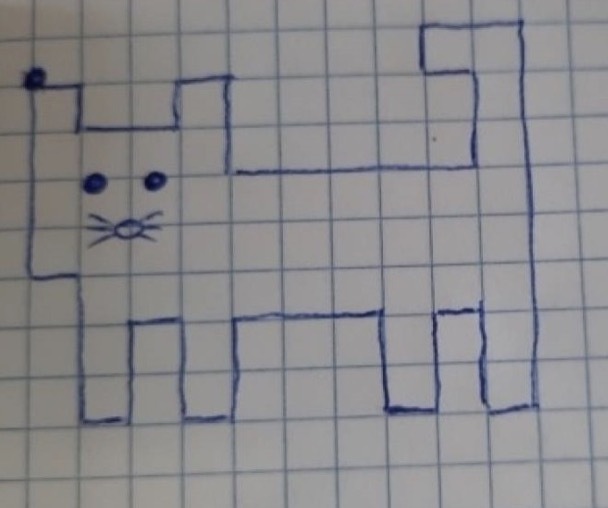 Ставим точку в самой первой клетке слева вверху. 1 клетка вправо, 1 клеточка вниз, 2 клеточки вправо, 1 клеточка вверх, 1 клеточка вправо, 2 клеточки вниз, 5 клеточек вправо, 2 клеточки вверх,1 клеточка влево, 1 клеточка вверх, 2 клеточки вправо, 8 клеточек вниз, 1 клеточка влево, 2 клеточки вверх, 1 клеточка влево, 2 клеточки вниз,1 клеточка влево, 2 клеточки вверх, 3 клеточки влево, 2 клеточки вниз, 1 клеточка влево, 2 клеточки вверх, 1 клеточка влево, 2 клеточки вниз, 1 клеточка влево, 3 клеточки вверх, 1 клеточка влево, 4 клеточки вверх.