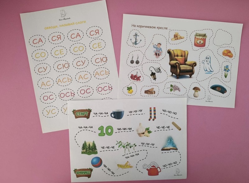Например: рабочий лист для автоматизации звука Ч в слоге: ребенок начинает со старта и произносит ЧА-ЧА-ЧА, и под этим ЧА-ЧА-ЧА проводит линию по штриховке. Далее произносит «Чашка» и обводит предмет. И так движется к финишу.
