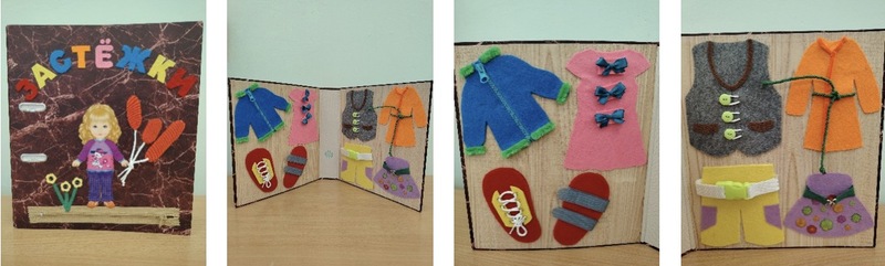 Игра «Застежки» представляет собой ширму, на которой представлены элементы одежды и обуви (куртка, платье, ботики, жилетка, халат, шорты, юбка) с определенным видом застежки (молния, кнопки, липучки, шнурки, пуговицы, пояс, карабин)