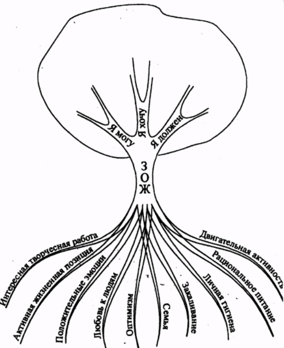 А сейчас я продемонстрирую вам дерево жизни (рисунок 1). Листья этого дерева – дни жизни человека. Каждый лист будет свеж и зелен, если крону будут поддерживать ветви: «Я могу», «Я хочу», «Я должен».