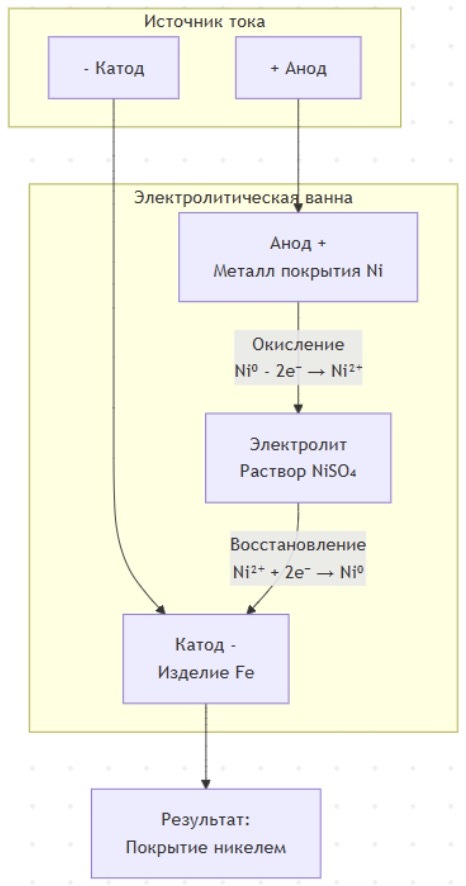 Ni²⁺ + 2e⁻ → Ni⁰ (катод) (покрытие изделия)