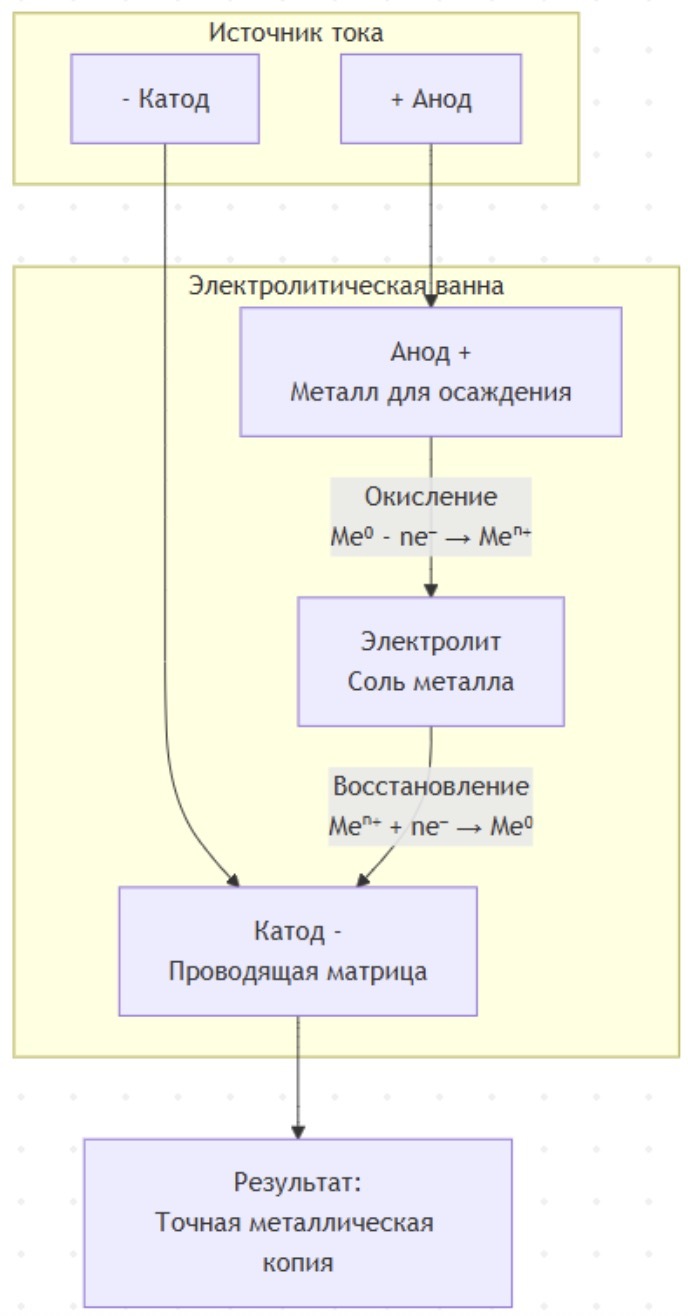 Что это? Получение точных металлических копий рельефных предметов. Основана на том же принципе, что и гальваностегия, но металл осаждается на форму-матрицу, которую затем удаляют.