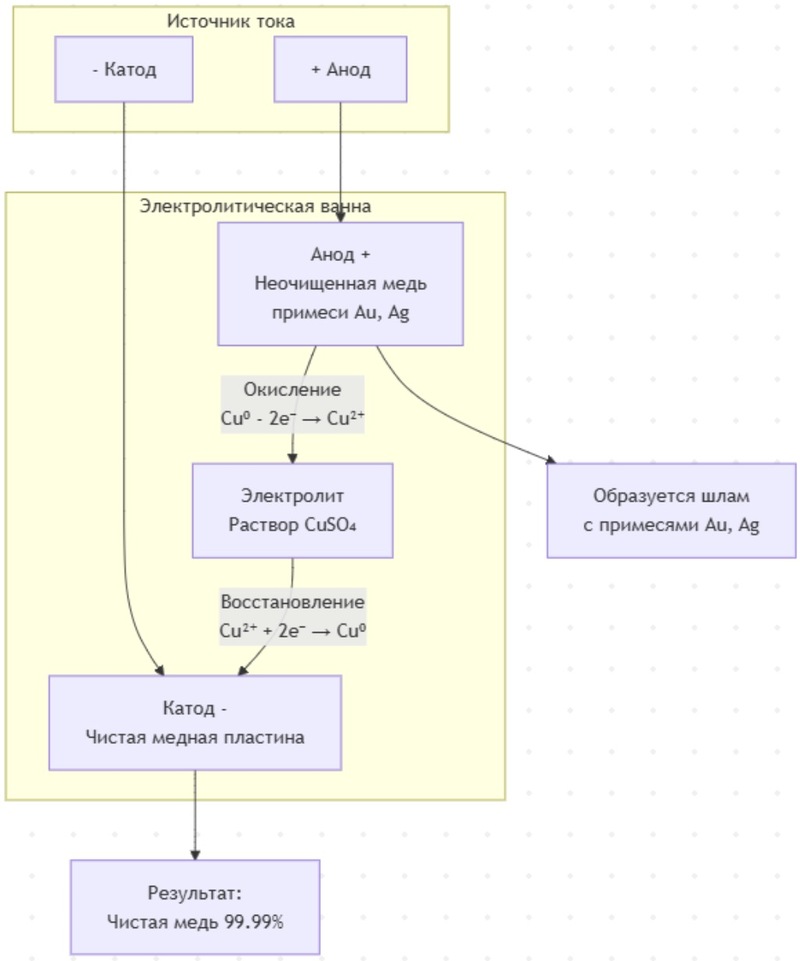 Суть процесса: При пропускании тока медь с анода растворяется (окисляется) и переходит в раствор в виде ионов Cu²⁺. Ионы меди перемещаются к катоду и восстанавливаются на нём, образуя слой чистой меди. Ценные примеси (золото, серебро) не растворяются и оседают на дне в виде ценного шлама, который потом извлекают.
