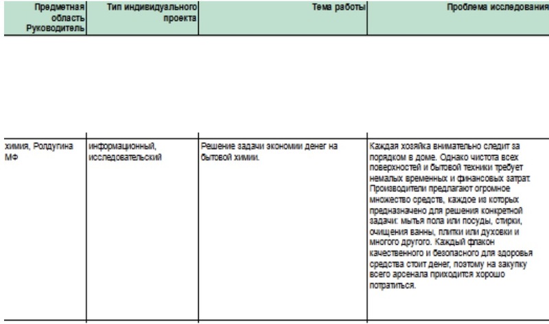Во – первых, для удобства проверки методологического аппарата учителем, своевременного выполнения плана работы над учебным проектом или исследованием, а также корректировки неточностей была создана гугл – таблица, которая постепенно заполняется старшеклассниками информацией о выбранной теме работы, цели, задачах, проблеме, гипотезе, методах, объекте и предмете исследования. В такой таблице одновременно могут работать и учитель, и обучающиеся внося, корректируя или удаляя данные. Ниже представлен фрагмент таблицы: