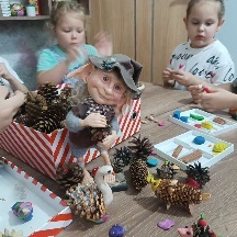 Когда я принесла Шишкогрызика детям, почувствовала их восторг, уважение и да, гордость за себя, что я сотворить такого забавного малыша. Наш герой участвует в организации продуктивной творческой деятельности, квестах, мастер-классах. Он привозит шишки на тележке, веточки, семена, крупы разных цветов. И мы творим вместе с детьми.