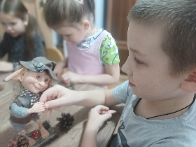 Новогодняя серия игрушек. Эти, непохожие на массовые игрушки, персонажи обладают особой праздничной энергетикой и открывают безграничные возможности для педагогической работы. Сам процесс знакомства с куклой – это погружение в сказку. Дети участвуют в изготовлении украшений для новогоднего интерьера, готовят подарки близким. Мы используем воздушный пластилин, массу для лепки, тесьму, пенопластовые заготовки, блестки и мишуру. Да много еще чего. При этом наши кукольные друзья всегда рядом. Они задают настроение, создают праздничную атмосферу. Это комплексное творчество, развивающее воображение и фантазию.
