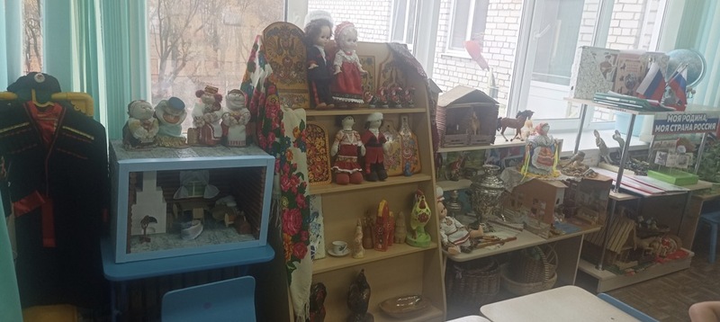 А в тот момент, когда мы начали знакомиться с бытом казаков, возникла идея создания казачьего мини-музея в группе. Совместно с детьми и родителями организовали пространство, которое позволяет глубже погрузиться в богатое культурное наследие казаков, также знакомиться с традициями, бытом историей и образом жизни казаков. В нашем музее можно не только рассматривать экспонаты, но и использовать для игр (например, макеты изб или куклы), наряжаться в костюмы и многое другое.