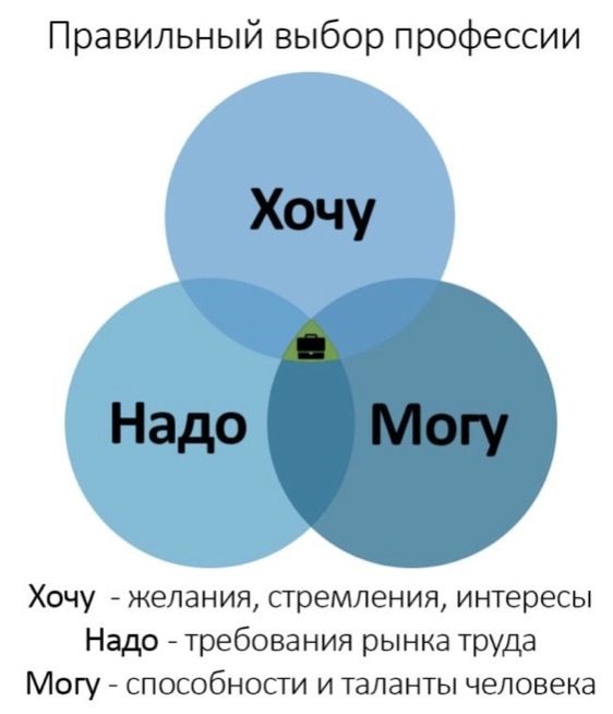 Данную формулу выбора профессии разработал советский психолог Климов Е.А. для помощи выпускникам в выборе профессии. Она позволяет учитывать интересы, способности, физические возможности человека и востребованность профессии на рынке труда. На пересечении всех компонентов (Хочу-Могу-Надо) и находятся самые подходящие для человека профессии, именно те, в которых он может быть успешен, те, которые будут приносить максимальное удовлетворение Что, по-вашему, означает эта формула? (Ответы детей)