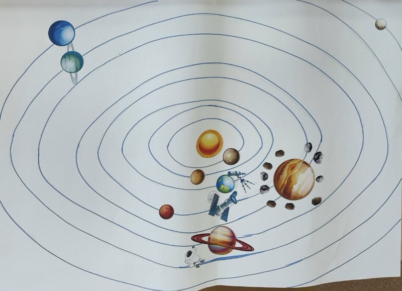 21 слайд. Мы накопили достаточно энергии для возвращения домой, но в пути мы потеряли карту солнечной системы, чтобы вернуться домой необходимо ее восстановить. Для этого у вас будет ватман, клей и планеты, а так же астероиды для астероидного пояса. Необходимо расположить планеты в правильном порядке, каждую на своей орбите.