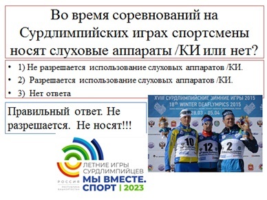 Ведущая: - Во время соревнований на Сурдлимпийских играх спортсмены носят слуховые аппараты /КИ или нет?
