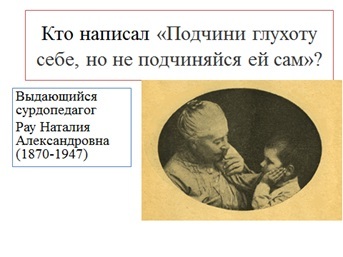 Ведущая: - Правильный ответ . Выдающийся сурдопедагог Рау Наталия Александровна (1870-1947).