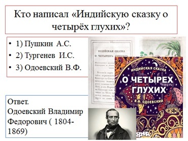 Ведущая: - Кто написал «Индийскую сказку о четырёх глухих»?