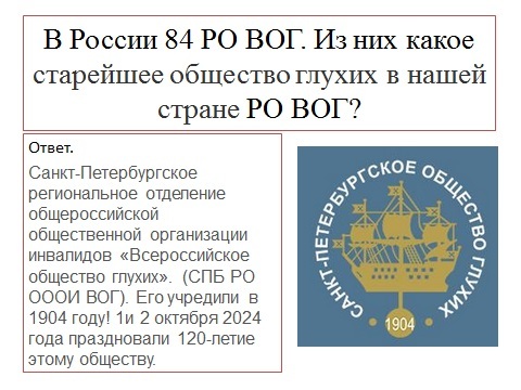 Санкт-Петербургское региональное отделение общероссийской общественной организации инвалидов «Всероссийское общество глухих». (СПБ РО ОООИ ВОГ). Его учредили в 1904 году! 1и 2 октября 2024 года праздновали 120-летие этому обществу.
