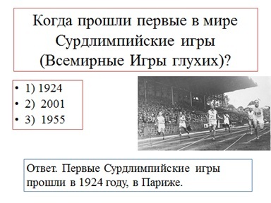 Ведущая: - Когда прошли первые в мире Сурдлимпийские игры (Всемирные Игры глухих)?