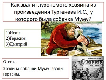 Ведущая: - Как звали глухонемого хозяина из произведения Тургенева И.С., у которого была собачка Муму?