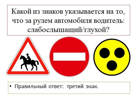 Ведущая: - Какой из знаков указывается на то, что за рулем автомобиля водитель: слабослышащий/глухой?