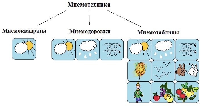 Структура мнемотехники: мнемоквадраты, мнемодорожки, мнемотаблицы.