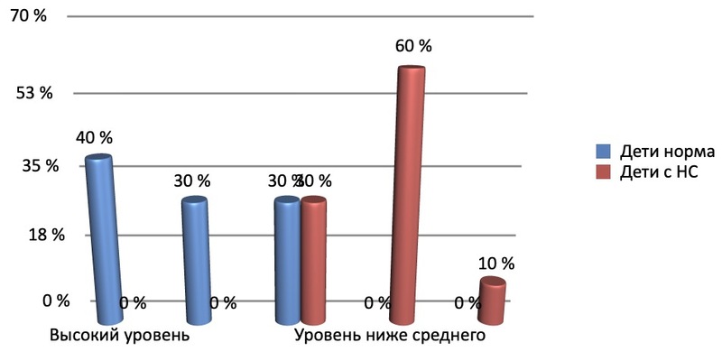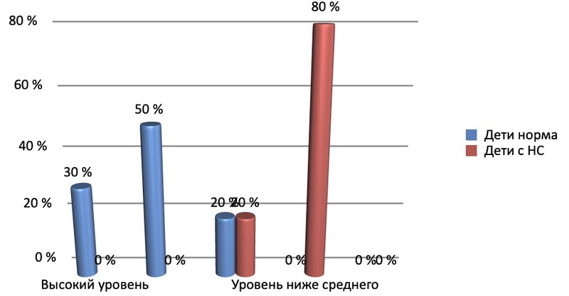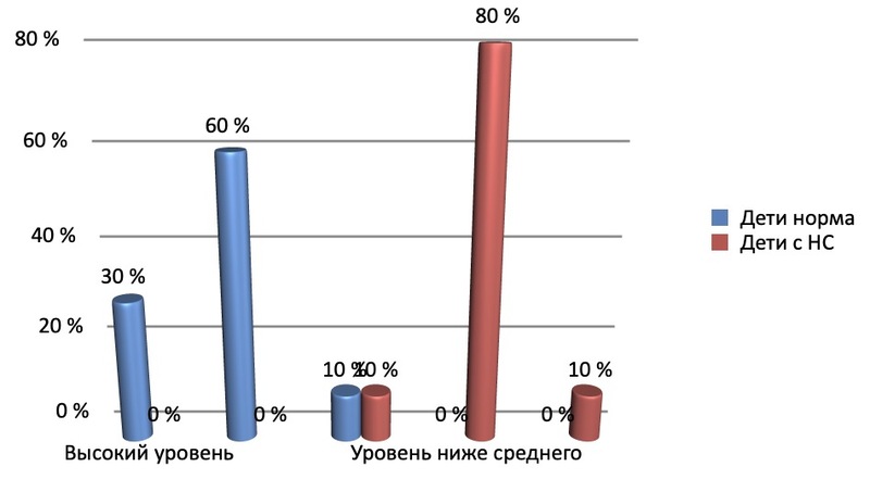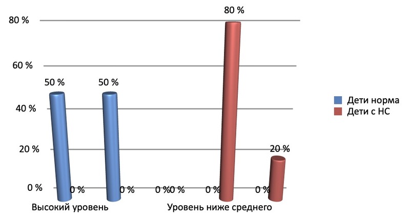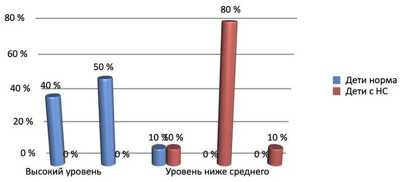 Высокий уровень продемонстрировали 4 (40%) ребенка с нормой речевого развития. Задания данной методики не вызывали затруднений у этих детей. Уровень выше среднего был выявлен у 6 (60%) детей с нормальным речевым развитием.