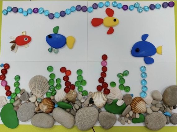 -Предлагаю вам поучаствовать в мастер-классе по созданию коллективной работы «Морская глубина». В работе можно применять различные камешки, пластилин, маркеры и т.д. (Включается расслабляющая, негромкая музыка, участники выполняют работу.)