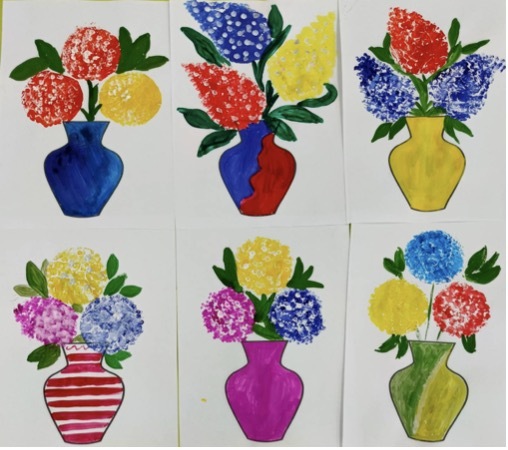 (практическая часть: рисование гортензии с помощью пупырчатой пленки и ватных палочек.)