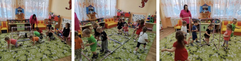 - 1.Трансформация «Воротики». Используется для тренировки ходьбы змейкой и для ходьбы с высоким подниманием колен. Дети должны преодолеть все секции ширмы. При выполнении упражнения проговаривается правильное выполнение упражнения.