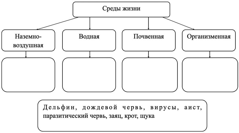 Предполагаемый ответ: - Каждая среда имеет свои условия для жизни организмов. Каждый организм приспосабливается к условиям своей среды обитания.
