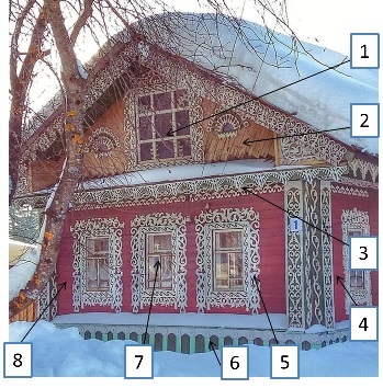 Чело (фасад), торец, наличник, причелины (крылья), окна, кровля (крыша, кров, фронтон), завалинка, чердачное окно, подзоры (полотенца).