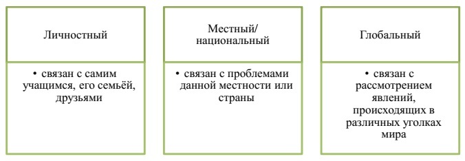 При этом каждая из ситуаций может рассматриваться на одном из трех уровней: личностном (связанном с самим учащимся, его семьей, друзьями), местном/национальном (связанном с проблемами данной местности или страны) и глобальном (когда рассматриваются явления, происходящие в различных уголках мира).