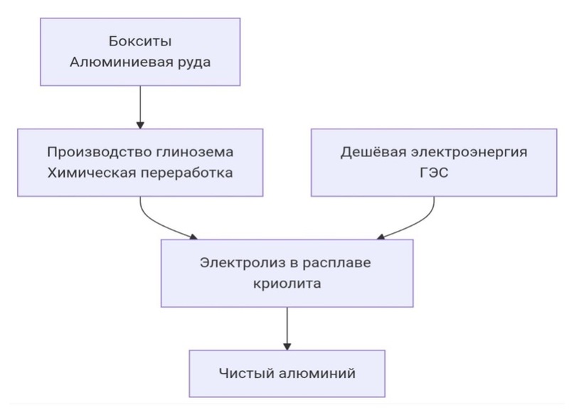 ⚡ Энергетический — производство требует очень большого количества электроэнергии (например, на 1 тонну алюминия требуется до 17 тыс. кВт•ч). |