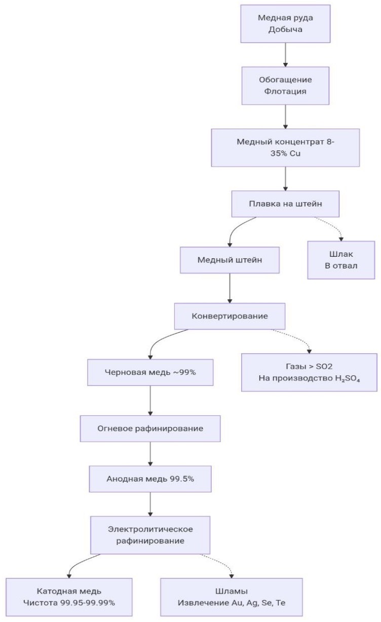Процесс производства меди из руды является многоступенчатым и основан на пирометаллургическом способе, который подразумевает высокотемпературную обработку сырья. Основная цель процесса — постепенное отделение чистой меди от пустой породы и многочисленных примесей.
