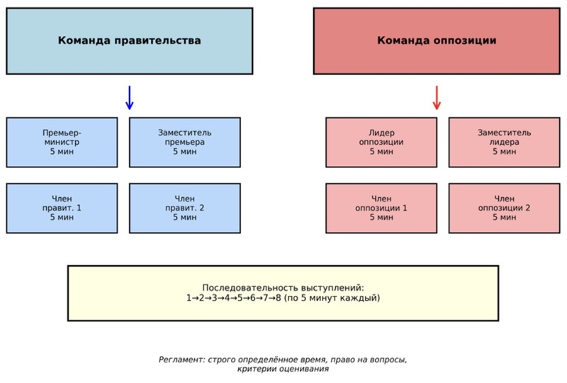 Рисунок демонстрирует чёткую последовательность выступлений, которая обеспечивает равные возможности для обеих команд и позволяет развивать аргументацию поэтапно. Регламент выступлений строго определён: каждый спикер имеет ограниченное время для своего выступления, что требует от участников умения концентрировать информацию и выражать свои мысли лаконично и убедительно.