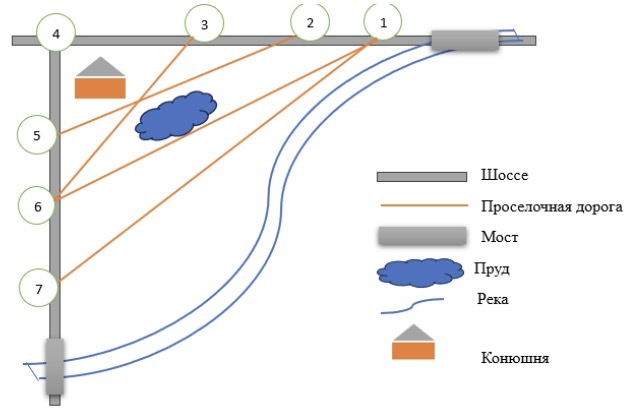 Задача. Таня на летних каникулах приезжает в гости к дедушке в деревню Антоновка (на плане обозначена цифрой 1). В конце каникул дедушка на машине собирается отвезти Таню на автобусную станцию, которая находится в деревне Богданово. Из Антоновки в Богданово можно проехать по просёлочной дороге мимо реки. Есть другой путь — по шоссе до деревни Ванютино, где нужно повернуть под прямым углом налево на другое шоссе, ведущее в Богданово. Третий маршрут проходит по просёлочной дороге мимо пруда до деревни Горюново, где можно свернуть на шоссе до Богданово. Четвёртый маршрут пролегает по шоссе до деревни Доломино, от Доломино до Горюново по просёлочной дороге мимо конюшни и от Горюново до Богданово по шоссе. Ещё один маршрут проходит по шоссе до деревни Егорка, по просёлочной дороге мимо конюшни от Егорки до Жилино и по шоссе от Жилино до Богданова. Шоссе и просёлочные дороги образуют прямоугольные треугольники.