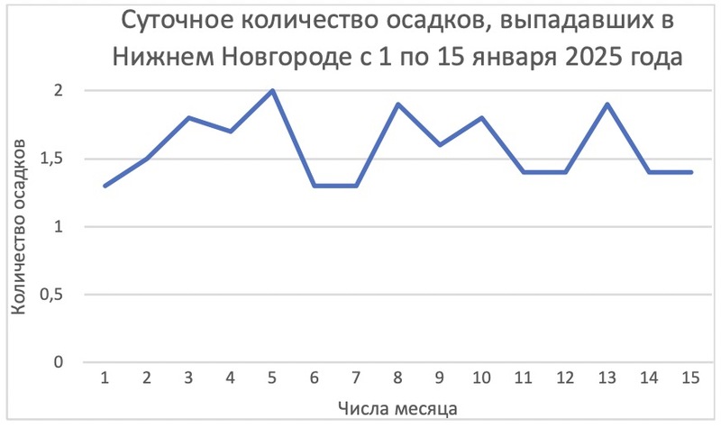 Задача. На рисунке жирными точками показано суточное количество осадков, выпадавших в Нижнем Новгороде с 1 по 15 января 2025 года. По горизонтали указаны числа месяца, по вертикали — количество осадков, выпавших в соответствующий день, в миллиметрах. Для наглядности жирные точки на графике соединены линиями. Определите по графику, какого числа выпало наибольшее количество осадков.