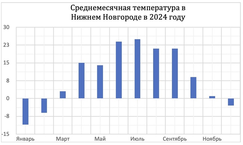 Задача. На диаграмме показана среднемесячная температура в Нижнем Новгороде за каждый месяц 2024 года. По горизонтали указываются месяцы, по вертикали — температура в градусах Цельсия. Определите по диаграмме наименьшую среднемесячную температуру в 2024 году. Ответ дайте в градусах Цельсия.