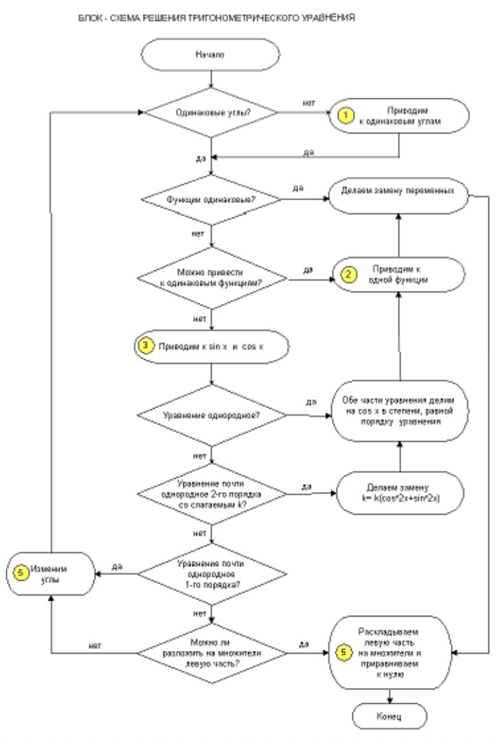 После применения данного алгоритма в течение нескольких лет, я могу подтвердить слова автора, что «блок-схема помогает настолько быстро овладеть приёмами поиска пути решения тригонометрических уравнений, что на заключительном этапе выполнения индивидуальных заданий ученики перестают ею пользоваться».