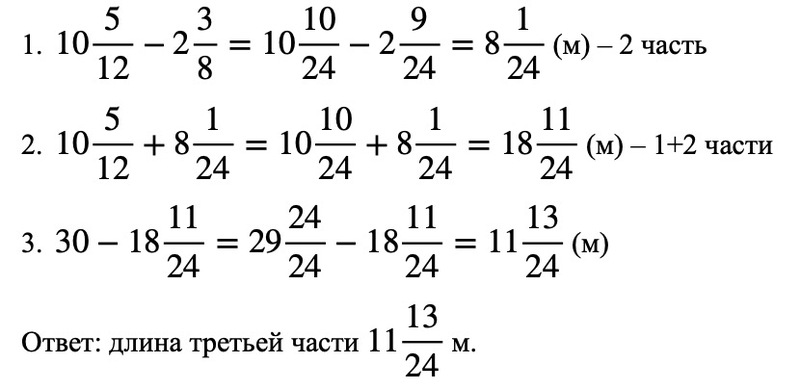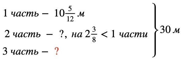 Провод длиной 30 м разрезали на три части. Первая часть имеет длину 10 5/12м, что на 2 3/8м больше длины второй части. Найдите длину третьей части.