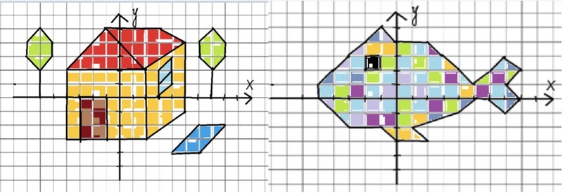 Попробуем провести небольшой эксперимент. Возьмем бумажный лист в клетку , построим на нем прямоугольную систему координат и отметим несколько точек с координатами: (1;1); (3;2) ;(5;1); (4;0); (1;1); (2;3) — плавник; (3;2). Соединяя точки по порядку, мы получим свой первый рисунок на координатной плоскости (маленькая рыбка)! Постепенно, усложняя задания, можно научится создавать более сложные и детальные изображения: от простейших геометрических фигур (точка, отрезок, квадрат, прямоугольник) до сложных и красивых картин пейзажей с животными и растениями, которые в дальнейшем можно весело еще и заполнить цветом.