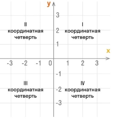 I четверть: x>0, y>0; II четверть: x<0, y>0; III четверть: x<0, y<0; IV четверть: x>0, y<0. |