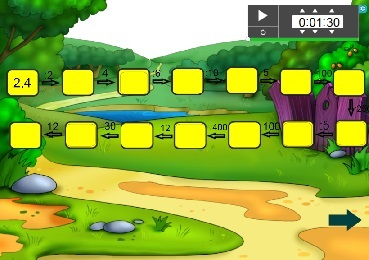 Первое задание «Кто быстрее» расположено на 4 и 5 слайдах. Это математическая эстафета. Так как в классе 26 учеников, то на каждом слайде, соответственно, по 13 заданий для каждой команды. После того, как озвучен ответ, нажимаем на пустые желтые окошки, и появляется ответ. Задания подобраны от простого к сложному. В правом верхнем углу находится таймер. Он используется для интенсификации работы, так как устанавливает крайний срок выполнения задания. Установленный таймер учит организовывать свою деятельность в соответствии с регламентом. После выполнения задания зеленая стрелка возвращает нас на слайд №3 с выбором задания. |