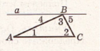 Нам дан треугольник АВС, проведем через вершину А прямую а, параллельную стороне ВС. Какими будут углы 1 и 4? Углы 2 и 5? Что можно сказать об углах 4,3,5?