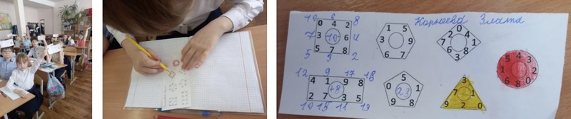 Решая выражение которые даны в геометрических фигурах, ответы записываем вне фигуры, напротив числа. Пригласить учеников по количеству фигур прикрепленных на классной доске, и они самостоятельно работали, затем проверили фронтально. (фотография ниже)