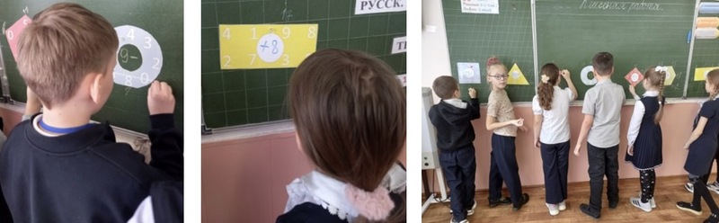 Можно пригласить учеников по количеству фигур прикрепленных на классной доске, и они самостоятельно работают, затем проверить фронтально , 2-3 пары - меня действия и цифру для решения внутри круга.